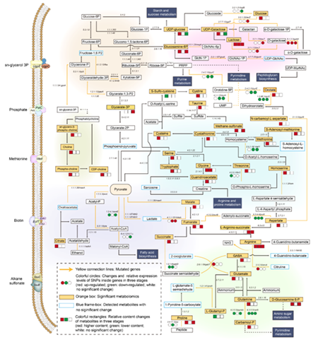 团队前期采用离子注入诱变结合定向进化方式,获得多株酸耐受表型存在显著差异的酒酒球菌突变株,结合多株耐酸突变株和酸敏突变株的比较基因组学、高酸条件下发酵过程中的转录组学及代谢组学数据,通过多组学联合分析挖掘酒酒球菌响应酸胁迫关键基因和关键代谢途径,构建其响应酸胁迫代谢网络模型,揭示酒酒球菌响应酸胁迫调控机制。研究成果为本土优良耐酸酒酒球菌菌种的定向选育及高酸条件下发酵调控奠定理论基础,也可为其他乳酸菌酸胁迫应答的分子机制研究提供参考。