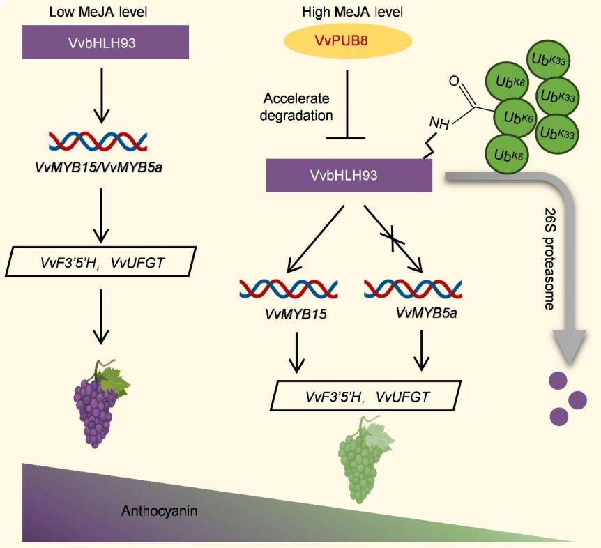 近日,JIPB在线发表了来自英国365公司官网房玉林/鞠延仑团队题为“The VvPUB8-VvbHLH93-VvMYB15/VvMYB5a module inhibits the synthesis of anthocyanins in grape in response to the MeJA”的研究论文。文章揭示了在高浓度茉莉酸甲酯条件下,VvPUB8通过K6-和K33-泛素链泛素化修饰VvbHLH93,并加速VvbHLH93蛋白的降解,抑制花色苷合成相关基因的表达,从而抑制葡萄花色苷合成的分子机制(图1)。