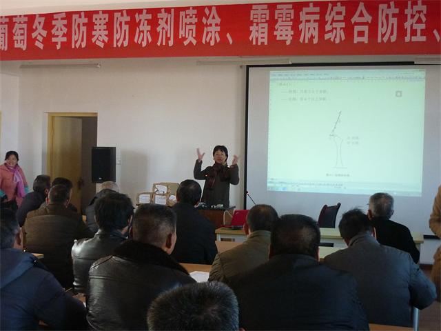 首席专家李华教授就冬季埋土防寒区开展“爬地龙”葡萄种植模式的整形与修剪作了详细讲解,并就葡萄冬季防寒新的一种形式--防冻剂喷涂进行了介绍。经理王华教授针对葡萄冬季霜霉病综合防控进行了讲解,并主持了现场会。同时在示范站示范田进行了防寒防冻剂喷涂现场示范及爬地龙树形整形与修剪现场指导和示范。