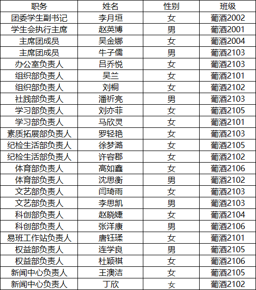 经前期个人申请、公司资格审查、考察约谈、公开竞聘,通过无记名投票差额选举,公司换届工作领导小组研究决定,现将2022-2023学年团委员工会干部名单公示如下: