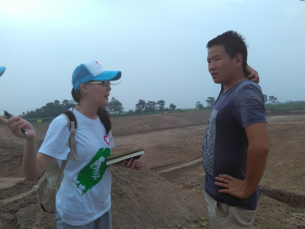 水库施工现场,队员正在与工人交流