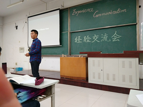 首先与16级新生做专业知识方面经验交流的是14级的卢晨学长。卢晨学长首先给16级新生介绍了自己的葡萄酒历程,涉及到品尝、实习、英语翻译等多个方面。随后从校内外葡萄酒知识的学习平台出发,讲述了葡萄酒专业的职业前景与职业规划。学长既幽默又富有深意的讲话让16级新生认识到了自己专业的特点以及专业知识的学习方法。