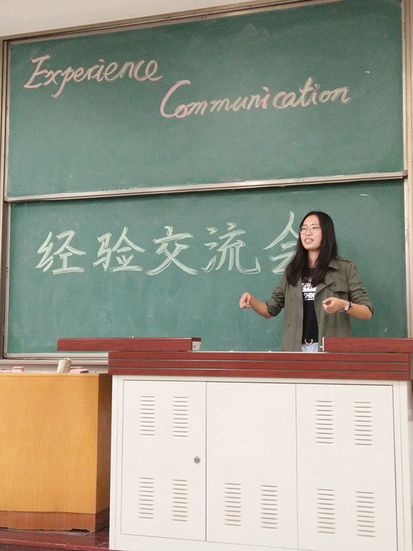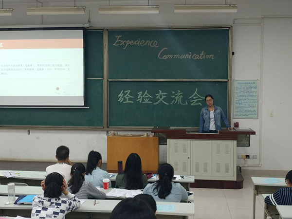 接下来与16级新生做雅思考试方面经验交流的是14级的滕域晰学姐。滕域晰学姐首先给16级新生介绍了“雅思是什么”、“为什么要考雅思”。随后,滕域晰学姐通过分享自己的雅思考试经历,向16级新生详细地介绍了雅思的考试流程以及考试流程。生动幽默的语言引发了阵阵哄笑。随后,学姐又强调了对雅思、托福等考试要注重点滴积累,让人受益匪浅。