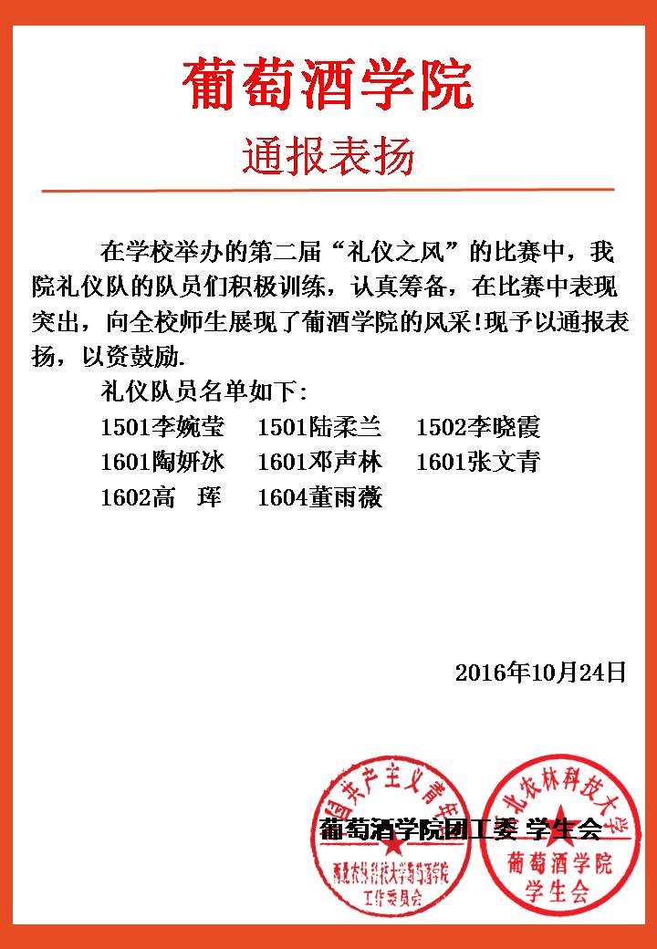葡酒团〔2016〕33号 通报表扬