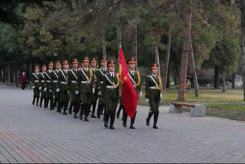 升旗仪式逐渐拉开帷幕,在主持人王若禹的引导声中,大家一起缅怀过去,迎接国旗的到来。伴随着国旗护卫队整齐有力的步伐,鲜红的国旗进入大家的视线。升旗仪式结束后,员工代表进行了国旗下的讲话。之后,由员工代表领誓,同学们面向鲜艳的五星红旗进行了庄严的宣誓: