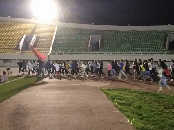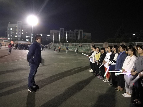 随后,学员们一起来到操场上进行热身运动,并由组织部的同学发放荧光棒。同学一起参加荧光跑,并由同学带领喊出“荧光健康跑,运动活力行。”