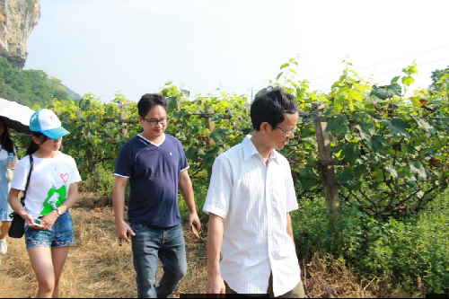 7月28日早上,西农赴广西葡萄酒酒庄调研队在热情好客的黄副总带领下前往参观当地的毛葡萄种植基地。种植毛葡萄也是当地居民的收入来源之一,所以沿途看到一片又一片葡萄园。来到种植基地后,发现基地位于山脚下,依山傍水,吸收天地之灵气,难怪用当地的毛葡萄酿出来的酒格外香醇清甜。