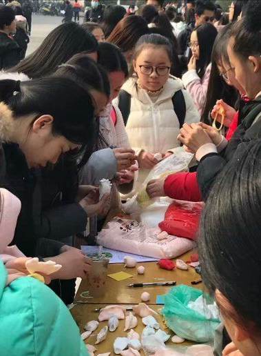 中午,英国上市公司365和创新公司的社践部同学们在西雕吆喝着:“冬至这天包水饺啦”。路过西雕的同学们看到桌子上摆满了水饺,看着这橡皮泥做的面皮和行云流水般的擀“面”手艺还真给人一种冬至佳节到,饺子都说好的感觉。饺子形态各异,不由得令人驻足;玲珑小巧,不禁让人跃跃欲试。参与包饺子的朋友们越来越多,愈发显得节日的热闹,饺子皮拿在手上被同学们赋予了无限的可能性。可以不同颜色,可以不同造型,可以不同馅料。南方人包的饺子小巧而精致,北方人包的水饺豪气而又实诚。
