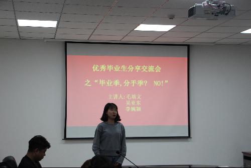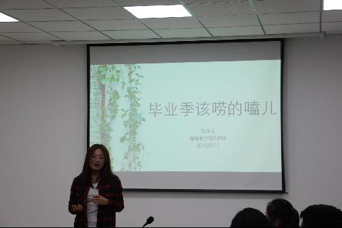 毛培文学姐分别从自我追求,学习科研,员工工作与社会实践,思想与世界观五个方面进行主讲。她通过举自己切身的事例让同学们更加直观的对学习生活,科创等方面有进一步的认识。并且她希望大家可以以宽容理性的心态去对待员工工作,把员工工作当作自己生活的一种调节品。要有自己独特的思维方式,才能做最真实的自己。