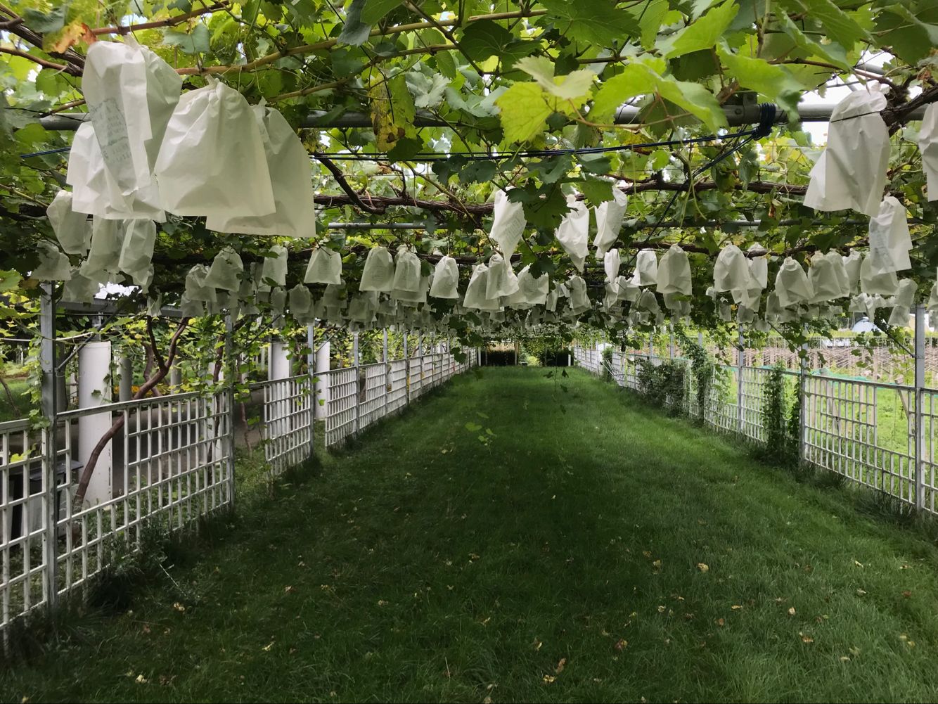 待纸袋取下,它将会如同七彩的灯笼挂在藤曼上,用香气和色彩装点这条小路。园主郭缠俊老师结合法日等国葡萄树种植管理之所长,结合当地特点开创了高支架型葡萄长廊。合理的枝蔓生长让我们感叹他所付出的心血。他说“我们在努力地与时俱进,让它不同于传统的葡萄生产地,而是变得更美观、高效,从而让人们改观对葡萄种植的印象。”在对葡萄树修剪方面他提到:做最精细的种植管理,做最简单的修建护理。在葡萄生产中坚持自然成熟,不催熟,打晚市场牌,品质牌。