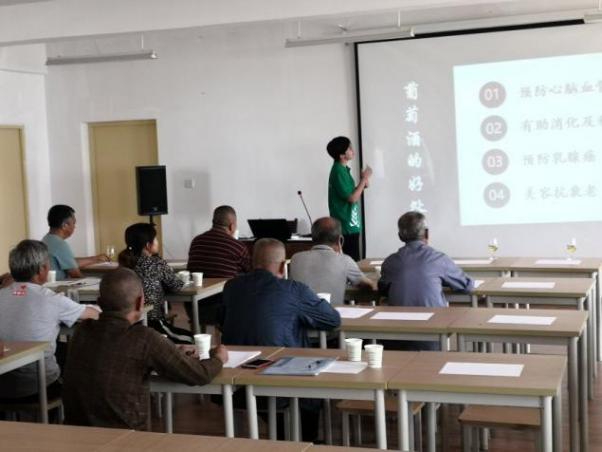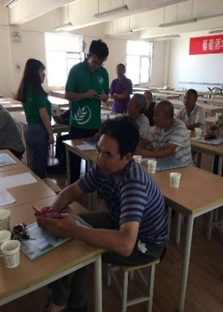第二步,丰富技术培训内容,穿插品酒花絮,安排老员工队员潘禹竹同学主讲葡萄酒品鉴知识,她是葡萄酒WSET二级品酒师,寓教于乐,让果农学习品尝干白、干红葡萄酒,感受品酒的美好生活,拉近与果农认识过程,品酒交朋友,小队努力建立扶贫攻坚调研队第一核心朋友圈,随时随地与果农交流。第三步,带队杨和财老师宣讲本次合阳扶贫攻坚调研的意义和安排,并以发放问卷、需求单、聊天等形式,零距离摸底果农的需求,并建立微信群以便果农以后提问。在建立微信群的时候,几位农户因不擅长使用微信,不知道如何加入,小队成员热情的帮助农户加入了微信群,并解答了农户在问卷上存在的问题。