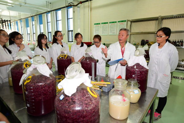 8月29日,李华(右)在位于陕西杨凌的实验基地内品尝经过干白发酵罐处理的葡萄汁。