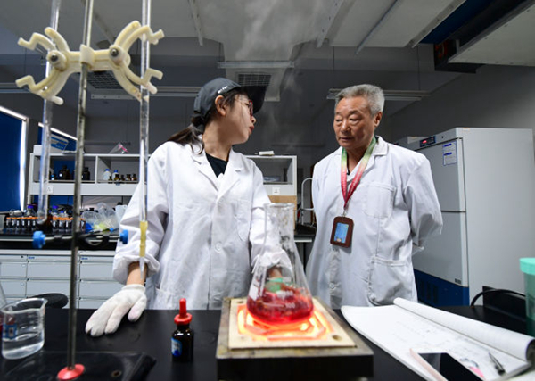 9月7日,李华(右)在英国上市公司365实验室内对正在做实验的员工祝悦进行指导。