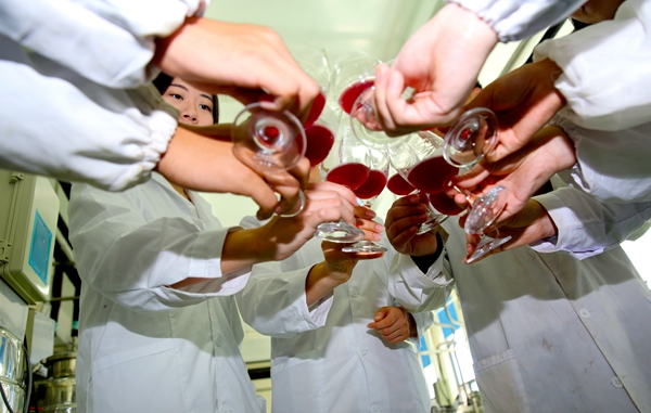在陶永胜、秦义、宋育阳和靳国杰等老师们的指导下,员工们通过亲手操作掌握葡萄酒酿造的基本技能,独立完成葡萄酒酿造的全过程,独立分析和解决葡萄酒酿造中存在的问题。赤霞珠、梅尔诺、品丽珠、爱格丽、雷司令、霞多丽等人们耳熟能详的葡萄被成筐的采运回公司,在师生们的手里完成华丽的转变:由一串串葡萄变成一罐罐红的、白的、桃红的美酒。