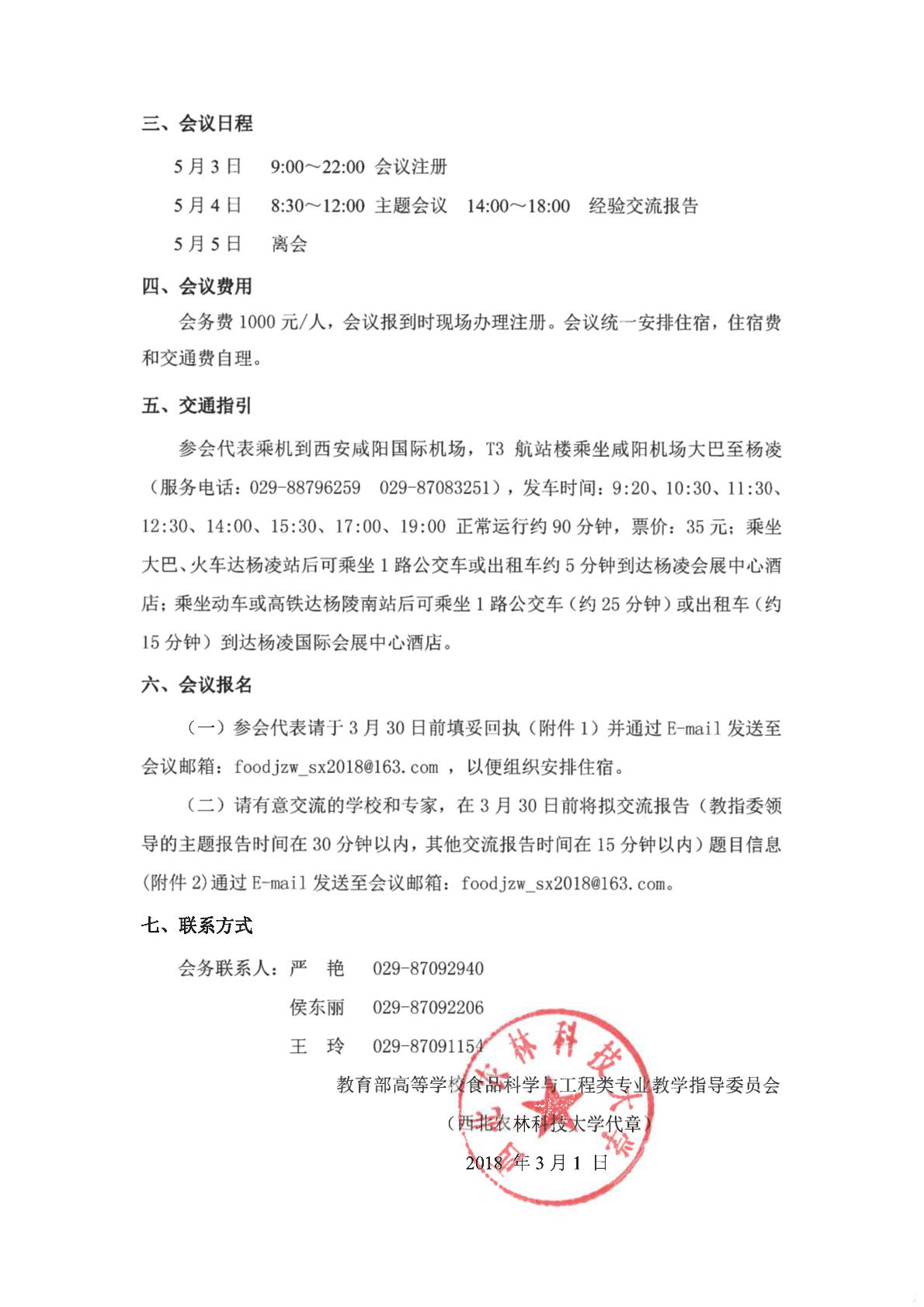 教育部高等公司食品科学与工程类专业教学指导委员会将于2018年5月3日—5月4日在陕西省杨凌农业高新技术产业示范区召开“2018年食品专业教指委第一次会议”,会议由英国365公司官网承办。诚邀各位教指委委员、各高校分管食品类专业教学工作的领导、院系或专业负责人以及相关专业教学老师们拨冗参加。