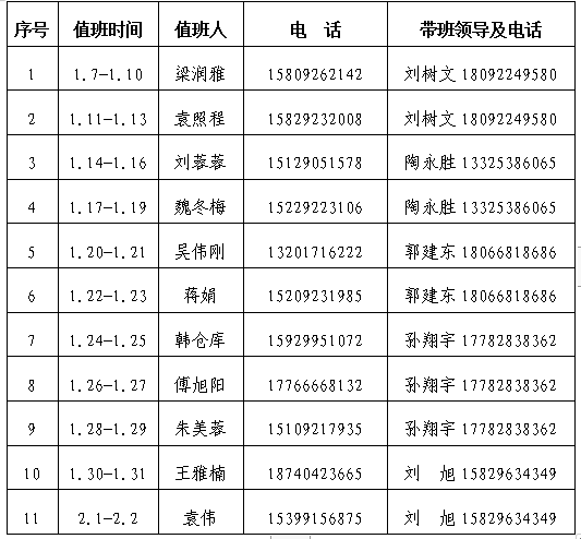 按照公司《关于做好2023年寒假放假安排的通知》要求,现将假期值班有关事项安排如下: