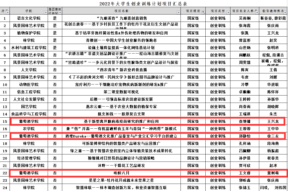 近日,校团委公布了公司2022年老员工创业训练项目立项结果,经过员工申报、院系评审和推荐、公司推荐、陕西省教育厅评审,公司“基于新型禽Ⅳ腺病毒疫苗研究的推广和应用”“酒理Eureka--葡萄酒文化推广品鉴室与产业交汇学习平台的建立”“听醉八月”3个项目被确定为创业训练国家级项目,国家级立项数获历史新高,位居全校前列。