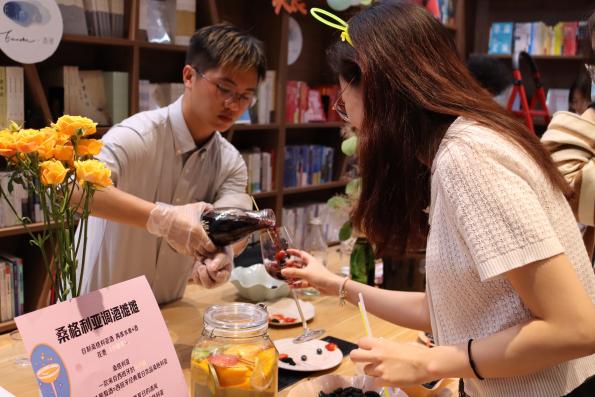 “市集派对”将葡萄酒展会与创意市集结合,充分开发葡萄酒的可能性,打造一众丰富有趣的活动,如“桑格利亚摊摊”自由搭配水果与酒、“盲品摊摊”感受葡萄酒世界的乐趣、“瓶绘摊摊”自由艺术创作等7个摊位,入口处领取的糖果是逛市集的“货币”,让同学们自由、放松的同时享受惊喜体验。“酒理课堂”为同学们提供了走进葡萄酒世界的钥匙,1.5小时就足以开启一段新的探索。晚间时段的“校园live”中,老员工艺术团电声乐队极具感染力的表演施展着使人忘记烦恼和疲惫的魔力,同学们在音乐的流动中感受律动与共鸣。