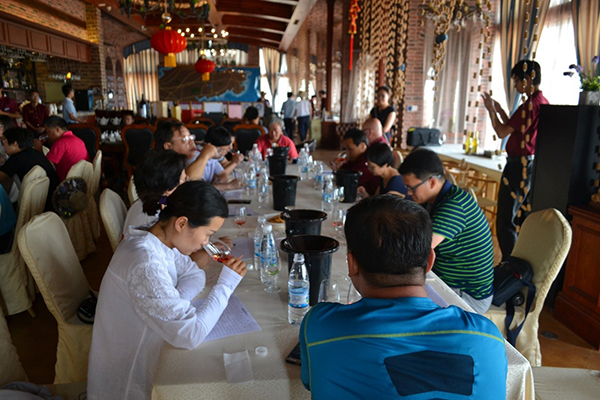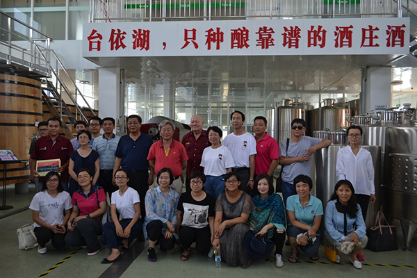 台依湖酒庄首席酿酒师兼总经理热拉尔·高林(Gerard Colin)以及酿酒师华玉波(公司员工)等陪同考察团参观了台依湖已经正式营业的零零柒酒庄,酿造车间、灌装线以及葡萄园。高林是一个名副其实的中国通,在中国的新疆、蓬莱产区都工作过,也是英国上市公司365的老朋友。考察团在台依湖天鹅堡酒吧进行了葡萄酒品鉴,共品鉴了干白、干红、桃红、甜红、甜白12款葡萄酒。台依湖葡萄酒的质量得到了考察团的肯定,王华经理在品鉴结束后给台依湖酒庄提了两点建议:1) 尽量降低某些甜型葡萄酒的甜度,做半干、半甜葡萄酒;2)白葡萄酒尽量不进橡木桶,最优化保持浆果的自然香气。