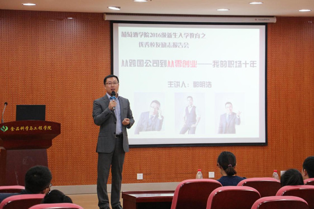 郭明浩员工首先讲述了自己十年的职场历程。从迈出校门加入跨国公司为葡萄酒品牌运营打拼到专注葡萄酒培训教育的执着,到现在放下一切从零开始从头创业创立知酒工作室,郭明浩员工的每一步都稳扎稳打用心专注,用实际行动赢得了葡萄酒行业的高度认可和良好口碑。在与同学们的互动环节,郭明浩员工愉快地向新生们分享了自己的老员工活和潜心读书的心得,并畅谈了自己的从业感受。他说,真正的铁饭碗是自己的真本事,要珍惜一切学习机会,多读书,勤体验,用知识武装自己。同时,要学会在成长中多给予和奉献,不要问公司为你做了什么,要多问你为公司做了什么。郭明浩员工强调,在万众创新的大环境下,同学们要比以往更加注重创新意识的培养,要勇于尝试从0到1的创造过程,敢于挑战和突破自我。