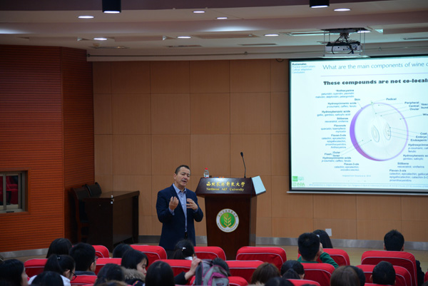 专业基础,思维碰撞。Laurent Torregros先生向同学们做了一场有关“如何在保持葡萄酒的质量的前提下,减少果实中的含糖量”的报告会。Laurent Torregros先生从葡萄酒的成分说起,为同学们讲解了葡萄的初级代谢和次生代谢过程。并提出了两个因素制约糖含量的因素:climate changes、consumers expectations。最后,Laurent Torregros先生从四个方面向大家介绍了如何在减少糖含量的同时保持葡萄酒质量。Laurent Torregros先生强调:葡萄酒行业的人才必须要掌握扎实的理论基础,深刻挖掘葡萄酒背后的科学知识,努力提高理论水平,成为带领行业发展的技术骨干。