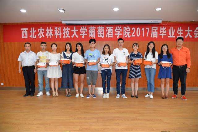 最后,房玉林经理、胡俊鹏书记、广州野城酒具用品有限公司总经理曾羽先生为毕业生赠送了独具专业特色的毕业礼物——野城酒杯、野城酒刀和公司T恤,公司领导希望同学们继续传承和发扬公司文化和精神,以酒杯和酒刀为媒介,运用葡酒人扎实的专业知识和精湛的专业技能,为推动葡萄与葡萄酒产业健康发展多做贡献。