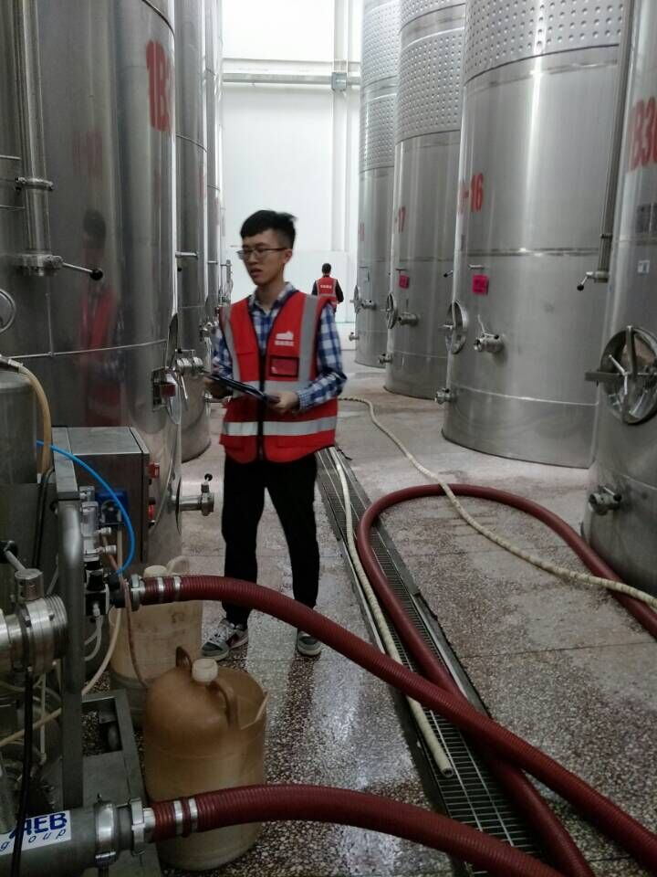 9月6日一早,同学们进入到生产岗位。在师傅的带领下,很快熟悉了岗位职责。原料验收岗位的李硕从葡萄采样、扣杂、测糖、登记、建档动作麻利,有条不紊。发酵车间的同学们认真记录着发酵过程的各组数据,同时也虚心向师傅们请教这葡萄酒工艺中各种问题。