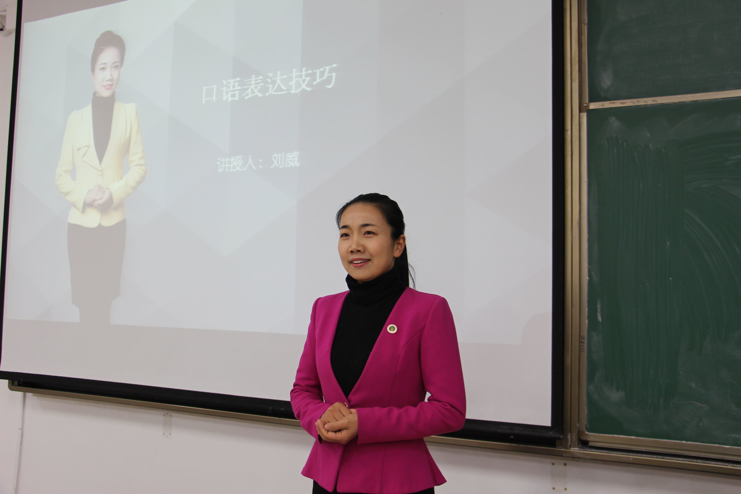 刘威老师以希腊哲学家伯里克利的名言“一个人如果他能够思想,但是不知道怎么表达他的思想,那么他和一个不能思想的人是一样的”开场,直接点出了口语表达的重要性。随后,她邀请了三位同学上台进行自我介绍,刘威老师从着装、站姿和声音等方面对他们的表现进行了点评。之后她带领全体同学共同学习了基本的礼仪姿势,和口语表达的要点,用“用心吐字,用爱归音;言为心声,情真意切”十六个字总结了口语表达的总体要求,她从最基础的发音开始,详细地讲解了说话时音调的高低、语速的快慢、响度的大小、气息的控制、对话的情景等方面对信息表达效果的影响。刘威老师与同学们互动不断,通过美文朗诵和配乐朗读将大家带入不同的对话情景中,现场播放了公司原创配乐朗诵《梦想西农》,让大家真切直观地体会口语艺术的独特魅力。最后,刘老师给出了一些嗓音日常保健的建议。
