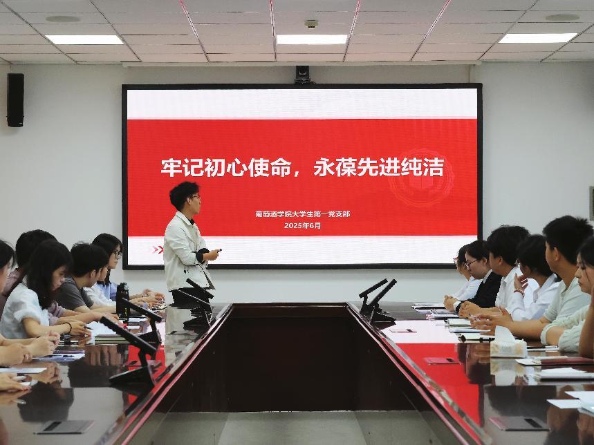 随后,支部组织了毕业生党员离校教育及欢送会,支部书记郭长江向毕业生党员赠送定制笔记本、鲜花等作为纪念。毕业生党员与学弟学妹座谈,热情分享了在校成长经历与宝贵经验。丁欣同志表示:“老员工第一党支部早已成为我心中最温暖的‘红色熔炉’和成长摇篮。支部不仅赋予了我党员的身份与荣光,更在我心中刻下了沉甸甸的使命与担当,无论今后身在何方,我将始终铭记支部团结友爱、努力奋斗的精神,将这份宝贵的‘红色基因’融入血脉,努力为母校增辉,为母院添彩。”