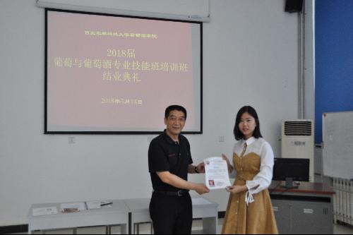 2018年5月14日下午公司举行2018届葡萄与葡萄酒专业技能培训班结业典礼,公司刘树文副经理、班主任张艳芳老师、任课教师靳国杰、科研秘书钱殷及2018届葡萄与葡萄酒专业技能培训班学员参加了结业典礼。