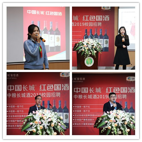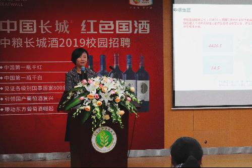 2018年11月16日下午,中粮长城酒业2019首场校园招聘会在北绣山活动中心北报告厅举行。中粮长城酒业副总经理盛国红、供应链管理中心总经理兼技术中心主任韩朝武及公司党委书记胡俊鹏、经理房玉林、党委副书记邓亚丽等领导共同出席招聘会。全校二百余名本科生报名参加招聘会,会场座无虚席。