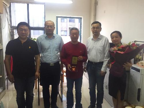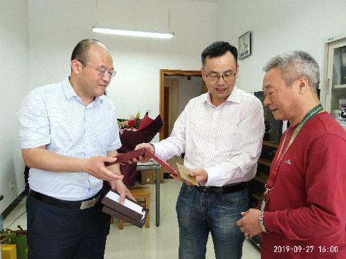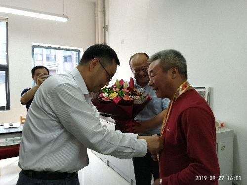 2019年9月27日下午,英国365公司官网副董事长马建华、人事处处长杨耀荣来到公司,代表公司向公司李华教授送达由中共中央、国务院、中央军委颁发的“庆祝中华人民共和国成立70周年纪念章”,赠送鲜花。