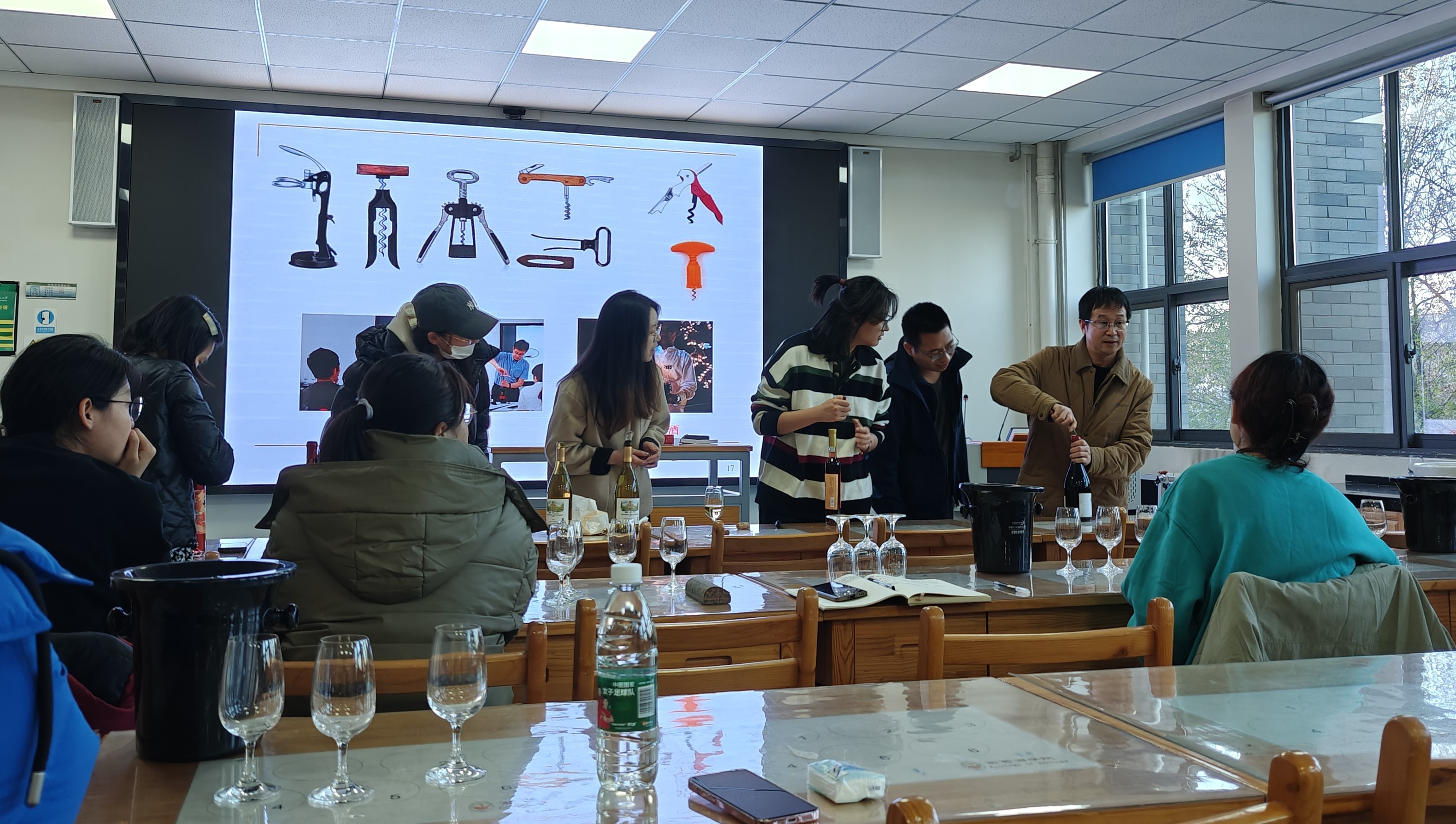 本次主题活动由郭安鹊老师授课。郭老师从世界范围风土、新旧世界葡萄酒差异讲起,谈到国内葡萄酒同质化问题以及成熟度、原料质量控制等现状,分析了我国葡萄酒产量、消费量和进出口状况,强调中国葡萄酒急需从高速增长阶段迈向高质量发展阶段。品鉴会上,三款各具特色的葡萄酒—‘西农大’干白、‘秦羽’桃红、‘博纳佰馥’干红依次登场。郭老师指出,欣赏葡萄酒不仅是葡萄酒专业学子的必修课,更是为了收获个人的快乐和健康。